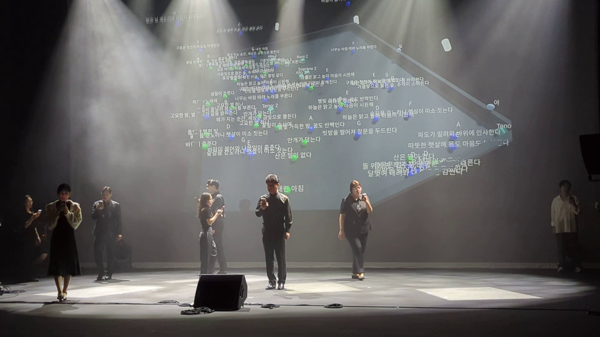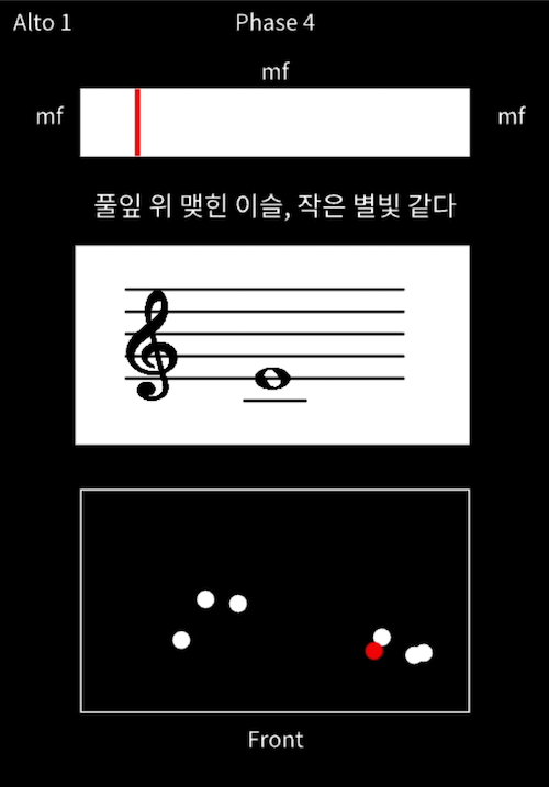 The process begins when the singer taps their smartphone, launching a ball from a virtual platform. Eight AI agents then navigate the space to intercept it. Each ball holds musical data, such as lyrics and pitch. When an agent catches a ball, this data is instantly sent to the singer's smartphone, updating a musical score in real time.
