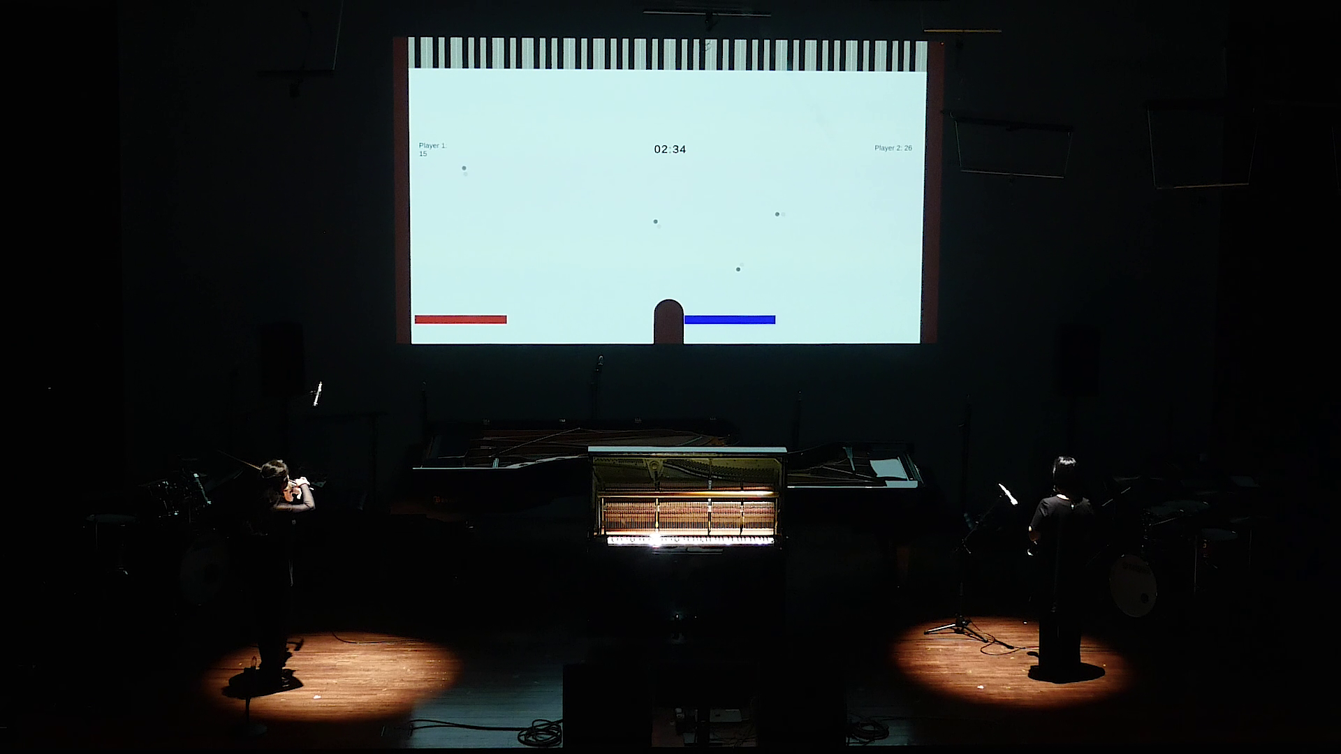 演奏によってパドルを操作しボールを跳ね返すことで、ゲームの状況が変化し、それが次に演奏するべき範囲を決定する。編成は安定したピッチが演奏可能な楽器2台と⾃動ピアノである。初演ではヴァイオリンとクラリネット⽤にアレンジした。プレイの状態によって⾃動演奏ピアノの演奏内容は決定される。段々とボールの数が増え難しくなっていくことにより、演奏の内容が変化していく。